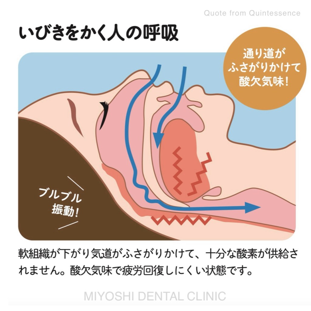 軟組織が下がり気道がふさがりかけて、十分な酸素が供給されません。酸欠気味で疲労回復しにくい状態です。